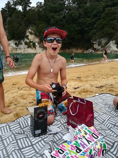 Die letzten zwei Wochen hatten wir Ferien. Es war super und wir haben viel erlebt. Die ersten 2 Tage waren wir in Anakiwa. Dort haben wir am Sonntag eine 5 Stunden lange Wanderung gemacht, den sogenannten Queen Charlotte Trak. Am Montag sind wir müde nach Hause gegangen und haben schon die nächsten paar Tage geplant. Am Dienstag sind wir dann nach Collingwood aufgebrochen. Unterwegs haben wir die Ngarua Höhlen angeschaut. Als wir in Collingwood angekommen sind haben wir schnell festgestellt, dass es dort nicht so spannend ist, das Dorf war praktisch ausgestorben. Und zum Znacht haben wir die teuersten Fish & Chips in ganz Neuseeland gegessen! (Anmerkung von Mami). Am Mittwoch morgen sind wir zum Cape Farewell gefahren! Dort hat es zuerst wie aus Kübeln geregnet.... ...aber als wir dann zum Wharariki Beach gekommen sind war das Wetter wunderschön! Und wir hatten viel Spass bei den riesigen Sanddünen. Später fuhren wir dann zurück nach Takaka wo wir am Pohara Beach auf dem Top 10 Holidaypark die Nacht verbracht haben. Die letzten paar Wochen waren Hammer. Wir sind zelten gegangen und waren im Marlborough Sounds. Ich erzähle jetzt etwas über unser Wochenende im Marlborough Sounds: Wir sind um 8.00 losgefahren um unsere 2 Stunden fahrt bis Havelock zu geniessen . Man sieht sehr viel cooles, anderes und komisches auf so einer fahrt. Unter anderem ein schön geschmückter Weihnachtsbaum! Ob es cool oder komisch ist, ist euch überlassen, anders ist so ein Baum im Sommer sowieso. In Havelock hat uns Nev mit dem Boot abgeholt. Auf der Fahrt hat er uns viele interessante Sachen erzählt und ich durfte das Boot steuern. Als wir im "Four Fathom Bay" angekommen sind, hat uns der Schlag getroffen. Denn wir haben nicht gedacht, dass uns eine so schöne Landschaft und eine coole "Villa" erwartet! Wir durften Nev's Rehe füttern, Sea Biscuit fahren und haben ein cooles neues Spiel gelernt, es heisst Tennisskoit, und viele weitere coole Sachen gemacht! Der einzige "Lärm" den man dort hört, ist das Meeresrauschen, darum haben wir super geschlafen. Leider ging das Wochenende viel zu schnell vorbei ... Die Zeit hier in Neuseeland vergeht sehr schnell. Wir sind schon fast 3 Monate hier. Ich gehe jetzt in den Tennisclub und in die Art-Class . Tennis spiele ich jeden Freitag nach der Schule. Der Tennisplatz ist neben dem Memorial-Park. In die Art-Class gehe ich am Montag nach der Schule in Riwaka. Mein Freund Brodie kommt auch in die Art-Class. Er hat ein cooles Haus mit einem Pool und viele Bäume zum klettern. Ich mache viele Origami und in der Schule wollen alle etwas haben. Ich habe eine lange Bestelliste. Letzte Woche mussten wir zu hause ein Gehirn basteln für die Schule. Ich habe eins aus einer Styroporballe und Modelierpaste gemacht. Der erste Schultag war am Donnerstag 8.2.2018. Wir wurden mit einer Maorizeremonie begrüsst und dann wurde uns alles gezeigt! Um 9.00. startet die Schule. Wenn wir wollen, dürfen wir um 8.00 in die Schule und dort Frühstück essen und in der Pause gibt es Milch und Früchte! Wir müssen jeden Tag Badehosen mitnehmen. Wir haben einen Pool und gehen jeden Tag schwimmen. Es ist ganz anders als in der Schweiz und es ist hier auch viel lockerer und sie sind auch nicht so genau wie wir Schweizer. Jeden Mittwoch gibt es gegrillte Würste mit Brot, eine Wurst kostet 1.50. An den anderen Tagen nehmen wir selber etwas zu essen mit. Um 15.00 ist die Schule aus und wir gehen nach Hause! In meiner Klasse sind wir 26 Kinder, meistens sitzen wir auf dem Boden und die grosse Türe ist meistens offen! Es gibt keinen Stundenplan, wir lernen etwas durcheinander. Mein Geburtstag war mega cool. Normalerweise habe ich im Winter Geburtstag, aber dieses Jahr durfte ich mitten im Sommer feiern. Wir sind mit einem Boot zum Split Apple Rock gefahren. Dort bin ich, Lukas und Daddy schwimmen gegangen. Dann kamen Fische und begannen um uns rum zu schwimmen. Wir haben sie mit Brot gefüttert. Auf der Rückfahrt durfte ich dann sogar ans Steuer! Zurück am Strand habe ich dann meine Geschenke ausgepackt, dabei war eine Mega coole G-Shock Uhr. Als dann low Tide war konnte ich wieder ein bisschen Skimmen üben, mittlerweile bin ich schon recht gut! Lukas hat einen super Sandhügel gefunden, dort sind wir mit den Boogieboards runter gesaust. Zuunterst haben wir sogar eine kleine Schanze gebaut! Zum Znacht habe ich mir KFC gewünscht, das gibt es in der Schweiz nicht. Die Chicken Popcorn haben mir am besten geschmeckt! Die Reise begann als wir mit Grosätti, Grosi, Marc und Heidi auf Spiez gefahren sind. Von dort sind wir mit dem Zug nach Zürich gefahren und übernachteten im Hotel. Am nächsten Tag, am 1.1.2018 sind wir mit der Fluggesellschaft Thai auf Bangkok geflogen. Dort haben wir in einem Dayroom noch ein bisschen geschlafen. Dann sind wir nochmal mit der Fluggesellschaft Thai auf Auckland geflogen und von dort sind wir mit der Air New Zealand nach Nelson geflogen. Dort wurden wir von Nana und Cess abgeholt und dann war die Reise fertig. Bis jetzt war die Zeit super! Wir sind ein paar mal zum Stand gefahren! Es gibt sehr viele Strände hier in der Umgebung! Das ist ein bisschen doof, weil ich mich einfach nicht entscheiden kann welches dass der schönste ist!!! :-)